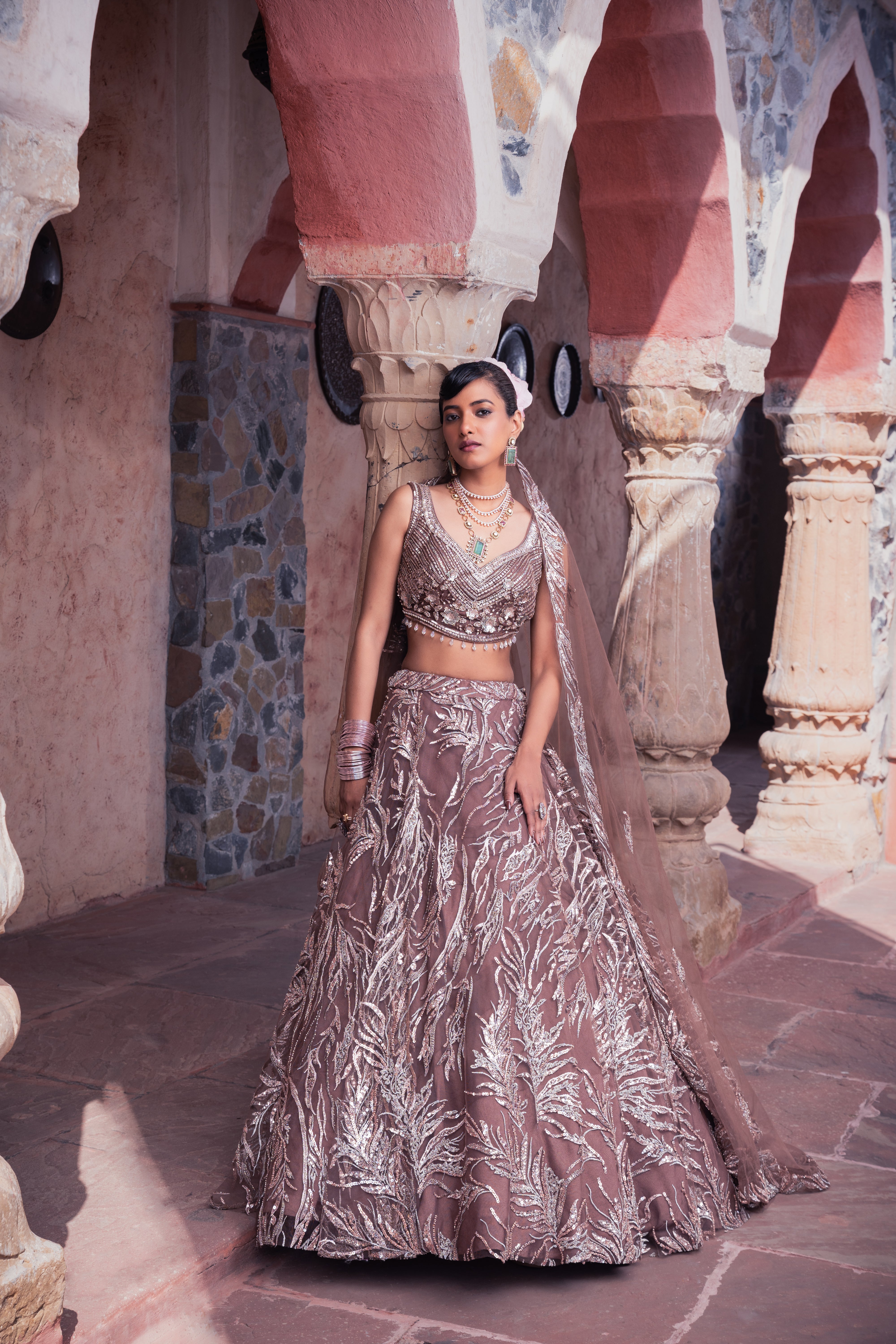 Featuring a Brown lehenga in net base with cutdana and sequins embroidery. It is paired with a blouse having sequins, cutdana and bead embellishments, including a dupatta. Accentuate it with statement earrings and heels for sangeet ceremonies.