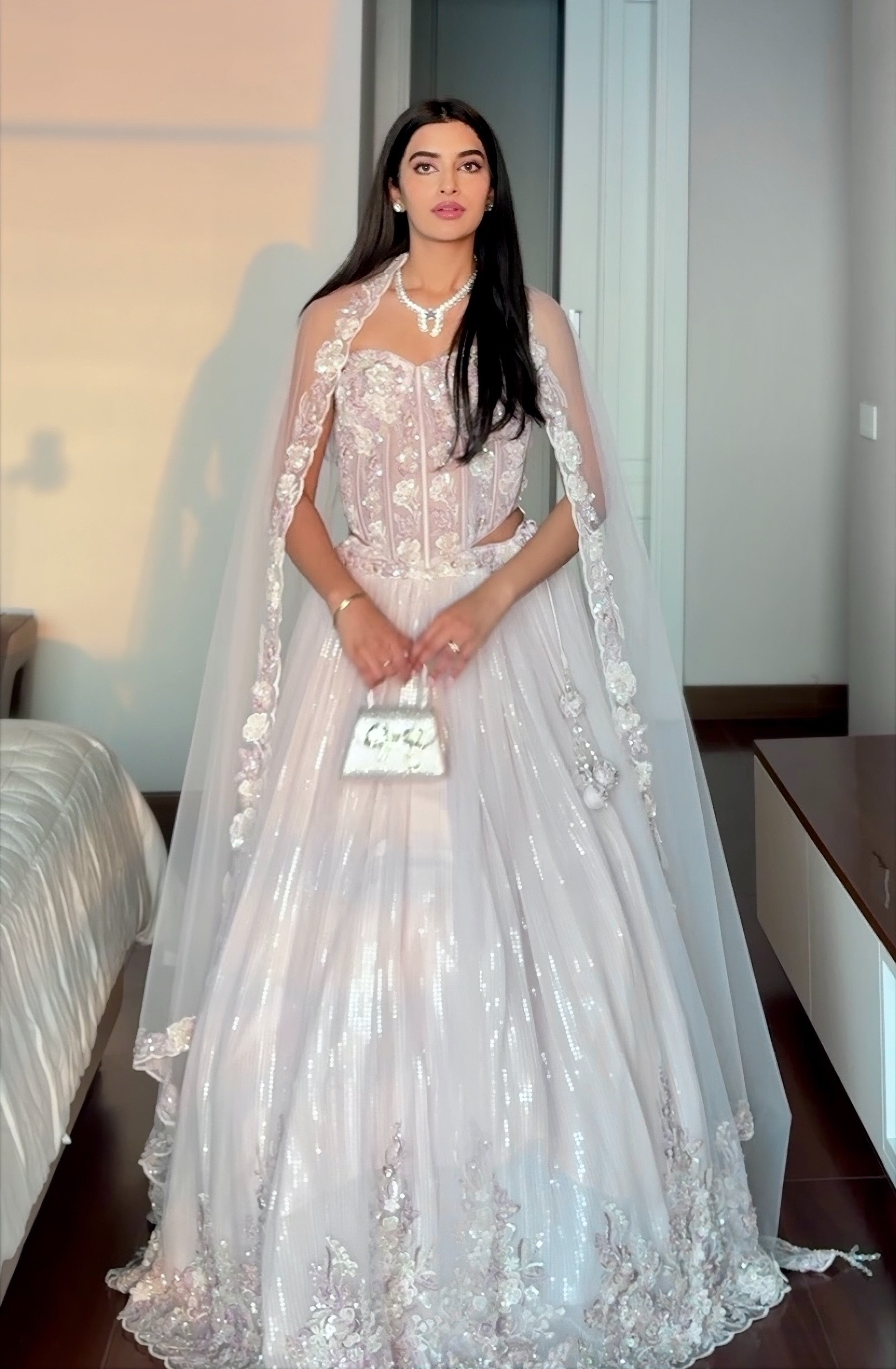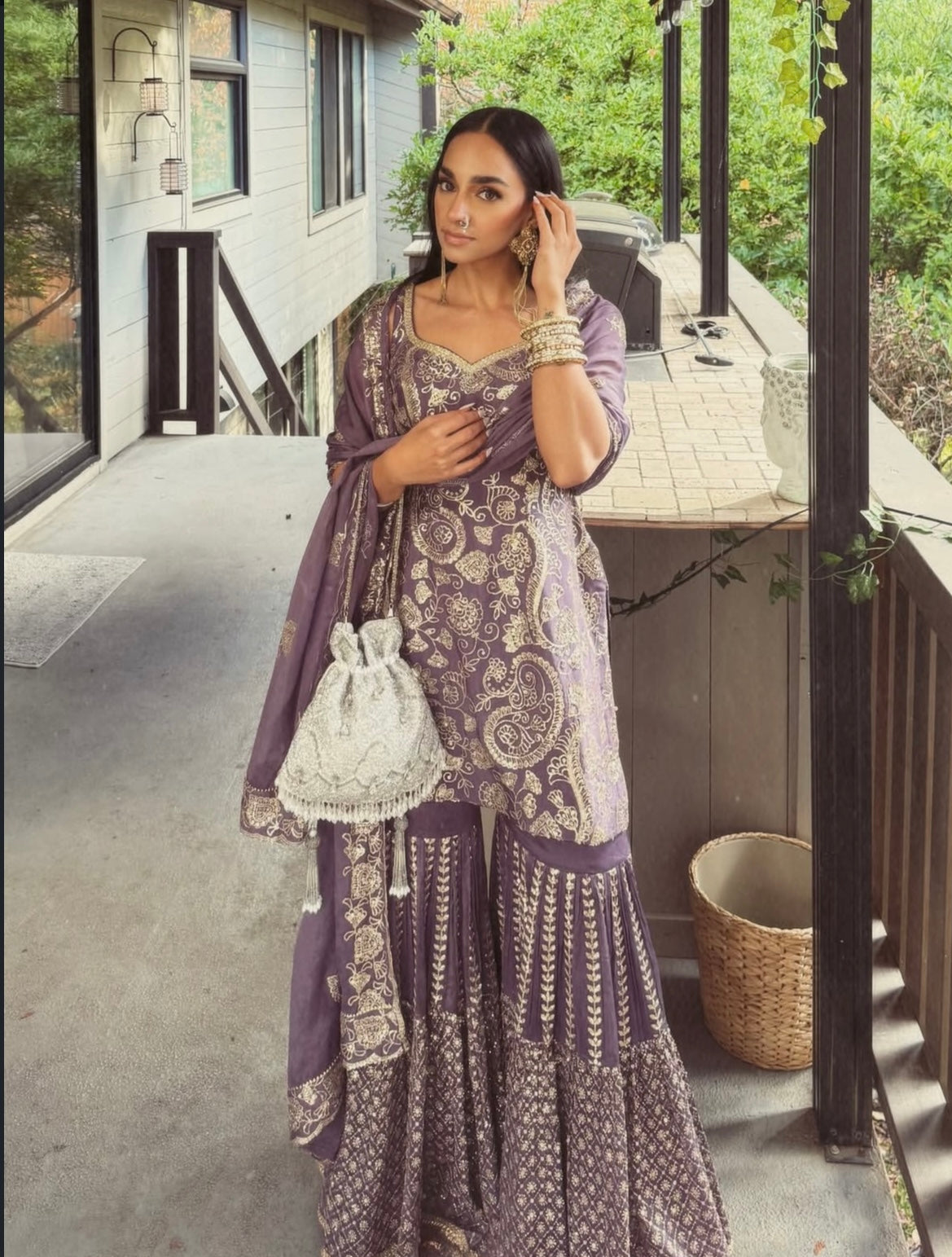 Sequin Zari adorned suit & Sharara with Latkan on Shirt Net Dupatta with detailing